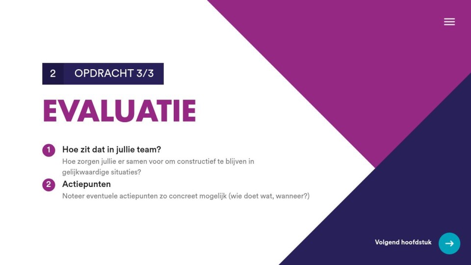 Opdracht 3/3 2 evaluatie 1 Hoe zorgen jullie er samen voor om constructief te blijven in gelijkwaardige situaties? Hoe zit dat in jullie team? 2 Noteer eventuele actiepunten zo concreet mogelijk (wie doet wat, wanneer?) Actiepunten Volgend hoofdstuk