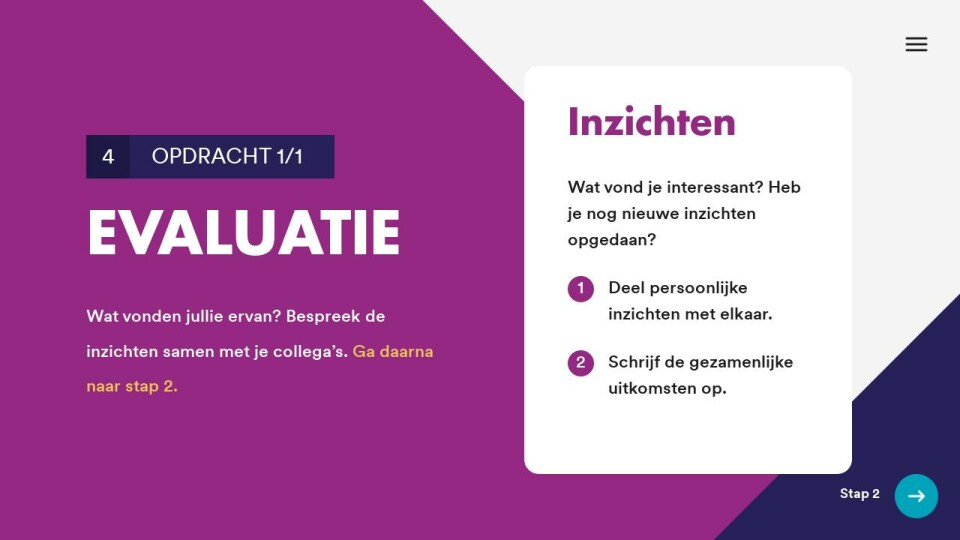 Wat vonden jullie ervan? Bespreek de inzichten samen met je collega’s. Ga daarna naar stap 2.